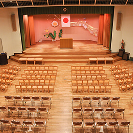 1500人収容できる大ホール。天井まで広がるステンドグラスからの光が美しく輝きます。
