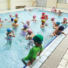 ソーラー式温水器付きで水温を調節。天窓から光が降り注ぐ開放的な空間で快適に水泳を学べます。